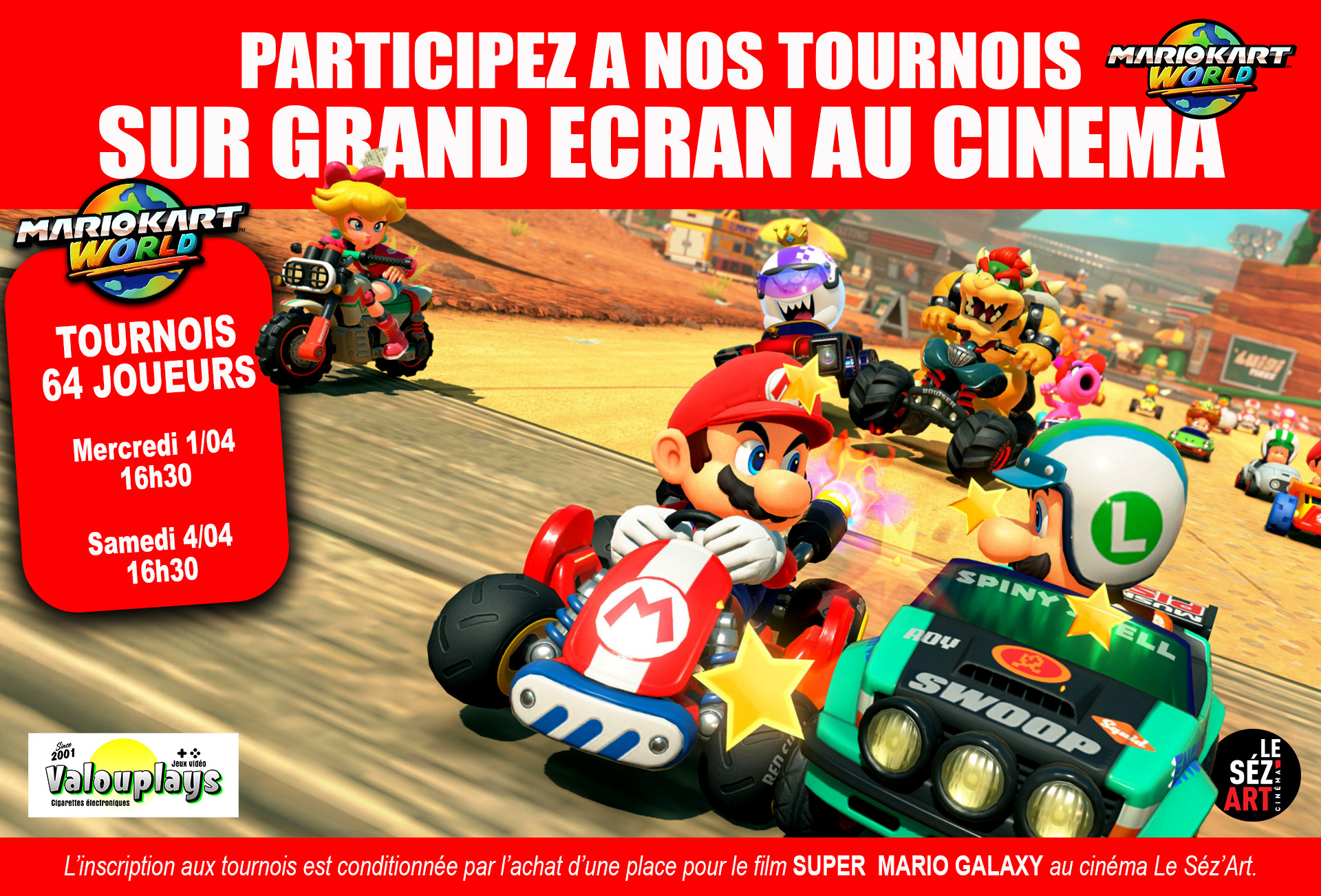 Grand tournoi 64 joueurs du jeu SUPER MARIO KART WORLD sur Grand écran au Cinéma Le Séz’Art.